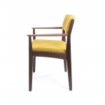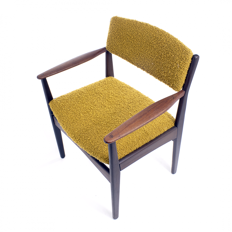 Poul M. Volther armchair for Frem Røjle ,walnut frame with teak armrest , symmetric lines with visible joints in ochre bouclé, Denmark, 1950s.